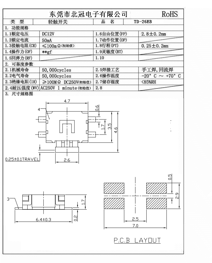 輕觸開關TS-26eb俗稱“中烏龜輕觸開關”,長寬尺寸為:4.7*3.5mm,屬于四腳貼片型輕觸開關,可以耐高溫。烏龜輕觸開關普通使用在玩具、安防、數碼、醫療儀器等行業,輕觸開關是北冠生產批發銷售的輕觸產品之一。