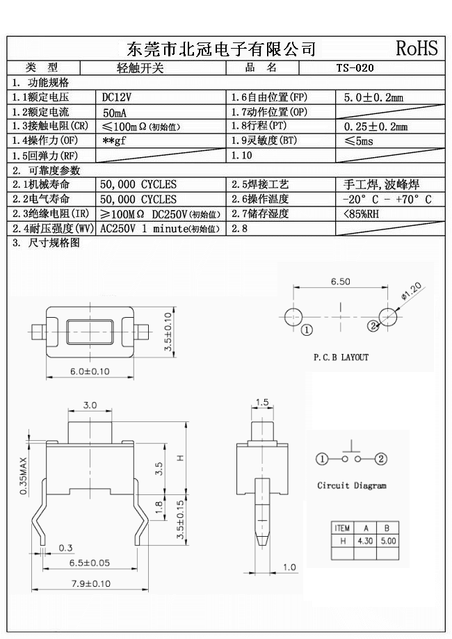 TS-020是3*6*4.3輕觸開關,焊接腳距是8.70,按鍵頭有黑色和白色兩種,袋裝為1000PCS/包,編帶3000PCS/盤,可過回流焊240度高溫