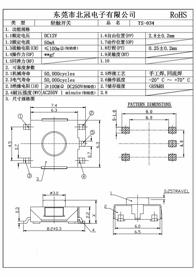 輕觸開關TS-034的長寬尺寸為6.0mm*6.5,有五個腳是貼片的,中間一個腳為固定腳。