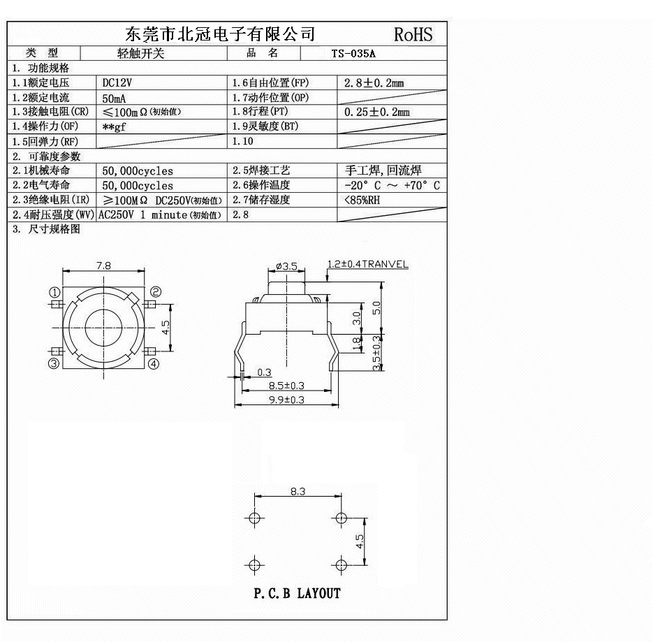 TS-035輕觸開關也稱為7.8*7.8硅膠輕觸開關無聲輕觸開關